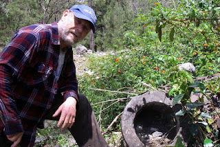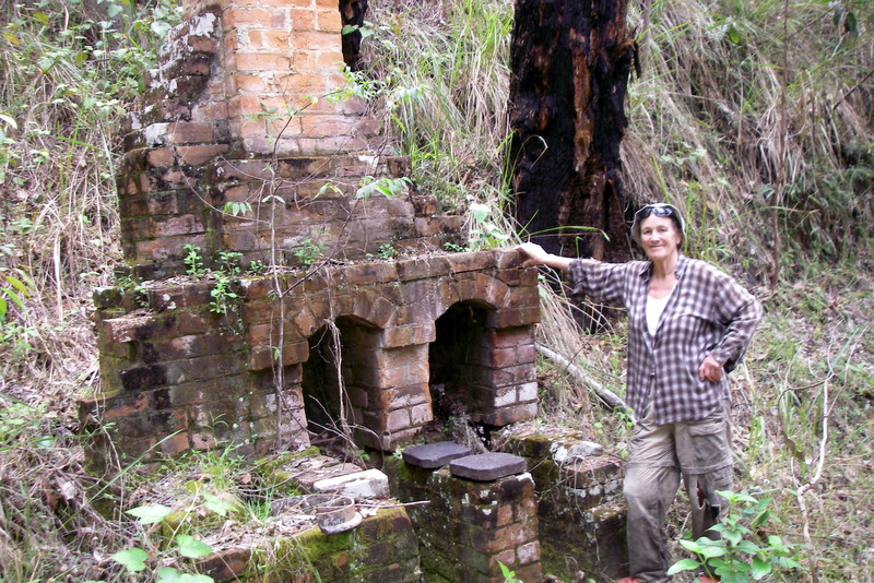 Investigating the concentrator site at the head of the creek, we discovered it had been re-arranged by flood since our last visit three years earlier. A wall of small, smooth stones had been washed out the creek and had invaded the machinery site, knocking the big boiler off its feet and covering most of it. The Huntington mill was hidden, that area completely overgrown with lantana in flower.