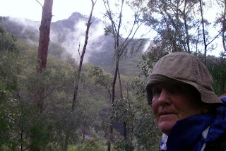After dressing in cold wet garb, I rolled up our wet tent, packed my bag and then we were off. And, do you know, we felt grand. Earth was awakening. Honey eaters and warblers were trying to out sing one another as sticky mist steamed off the hills. Far below we caught glimpses of our destination; the winding ribbon that was the Mann River.