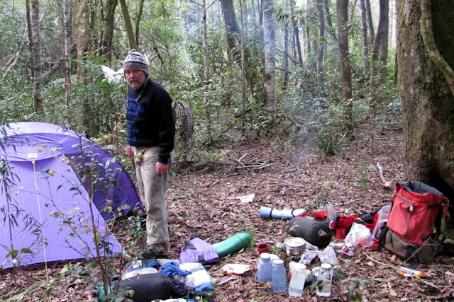 First requirement then was to find water. We’d passed none since leaving camp that morning, so we plotted a waypoint to a watercourse shown on the map that we found relatively easily after hearing cascading water within minutes. Nothing is grander than pure mountain water. Its cool sweetness is so refreshing we guzzled a litre each before filling our water bottles. Late afternoon now and needing a campsite we trudged on while the undergrowth grew ominously thicker. Our world got darker from thickening vegetation as our clothes became drenched in sweat. Then as sometimes happens, the forest floor became open with leaf litter and I immediately chucked down my bag, calling out that’s enough. We’d tackle the escarpment tomorrow. Happy Anniversary Love.