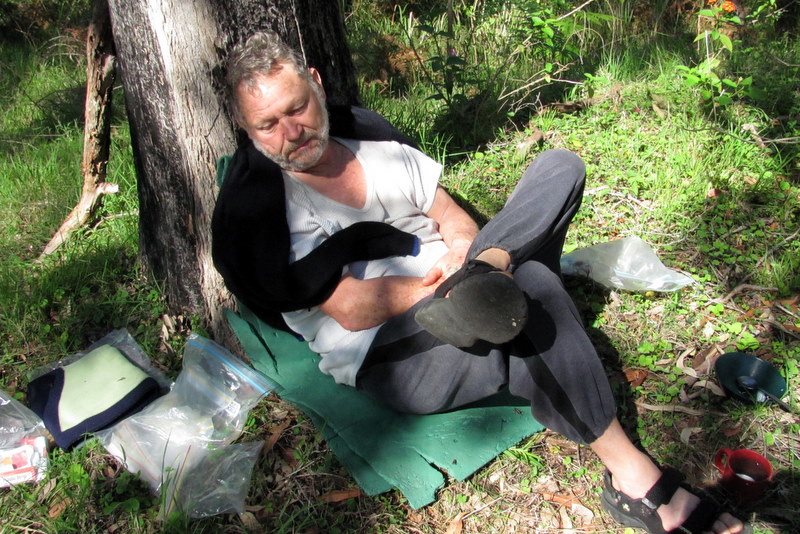 It rained that night. Dawn, if you could call it that in such a dark hollow, was shrouded in mist and wet with drizzle. A perfect excuse to stay in bed. Man, my legs were a mess; stiff, swollen, scabbed and cramping unless kept straight out. I made a cuppa for my lady then we had brekkie in bed. The drizzle turned to honest rain, so we cuddled up to belatedly celebrate 42 years of marriage. That wiped out the morning and we didn’t emerge from the tent until past midday after declaring it an official rest day.