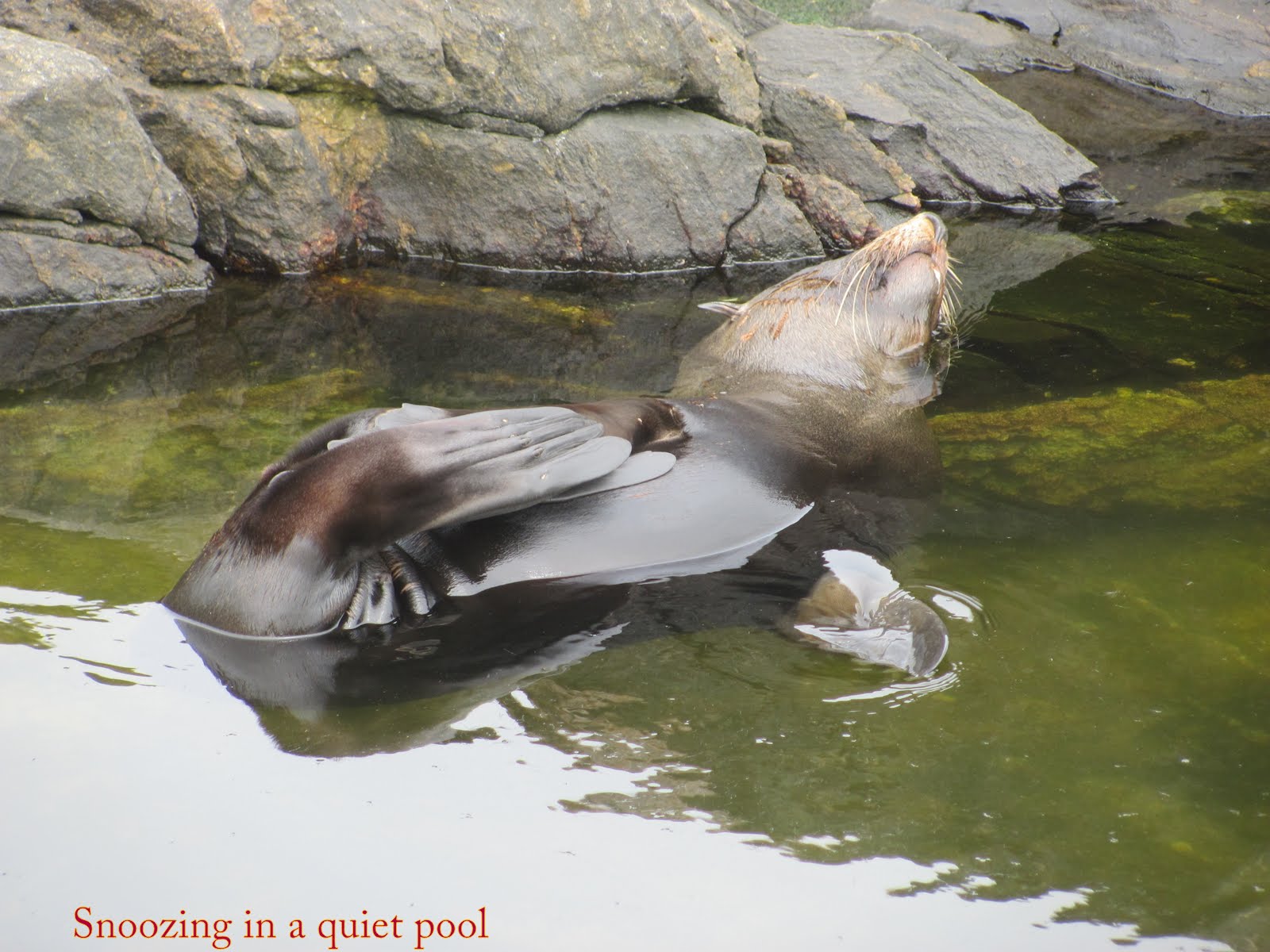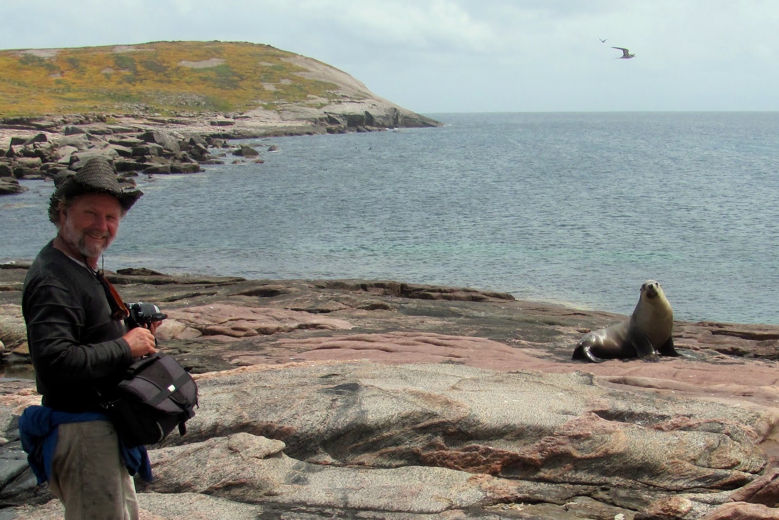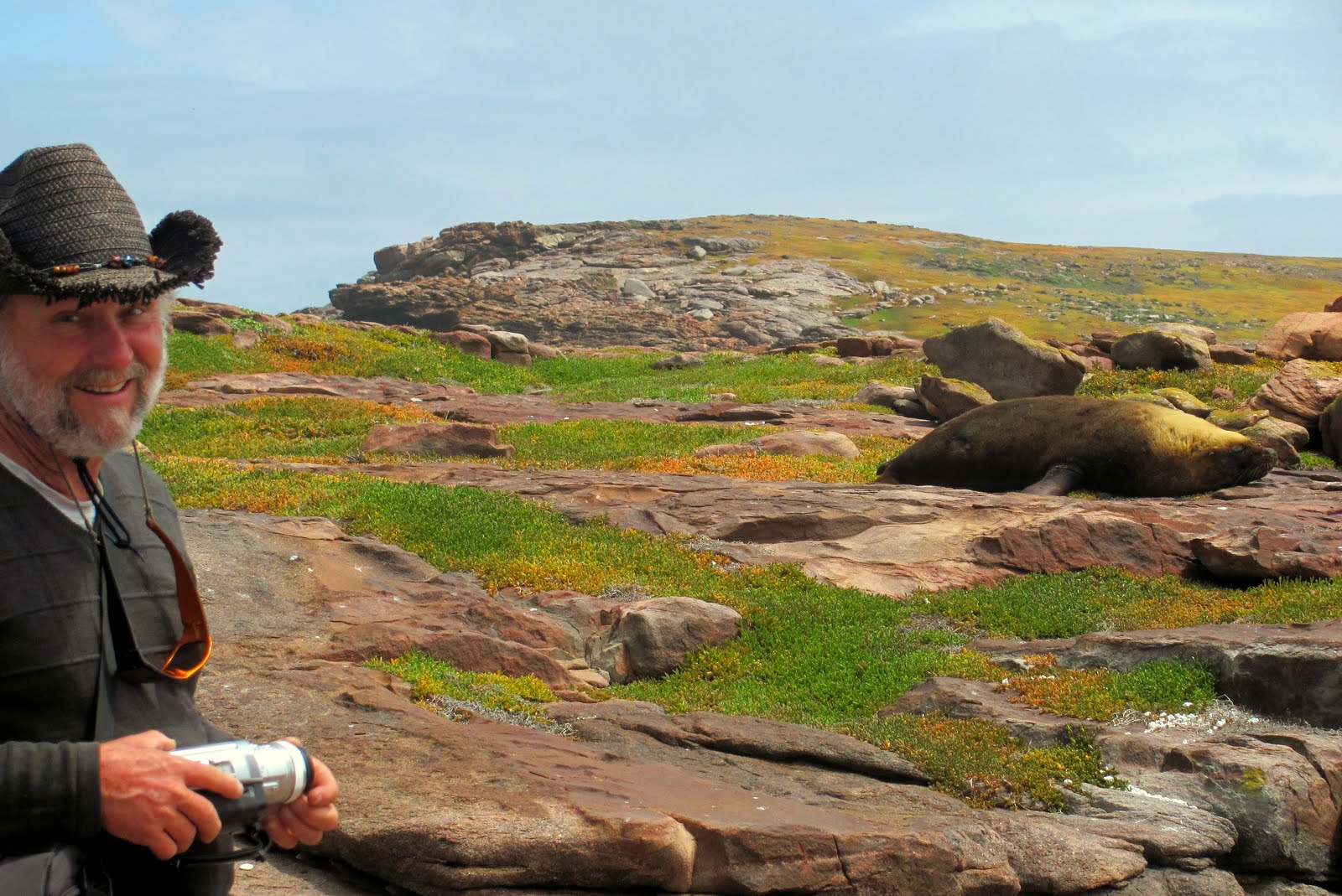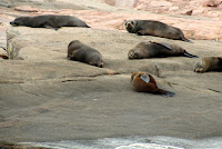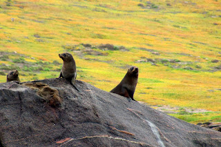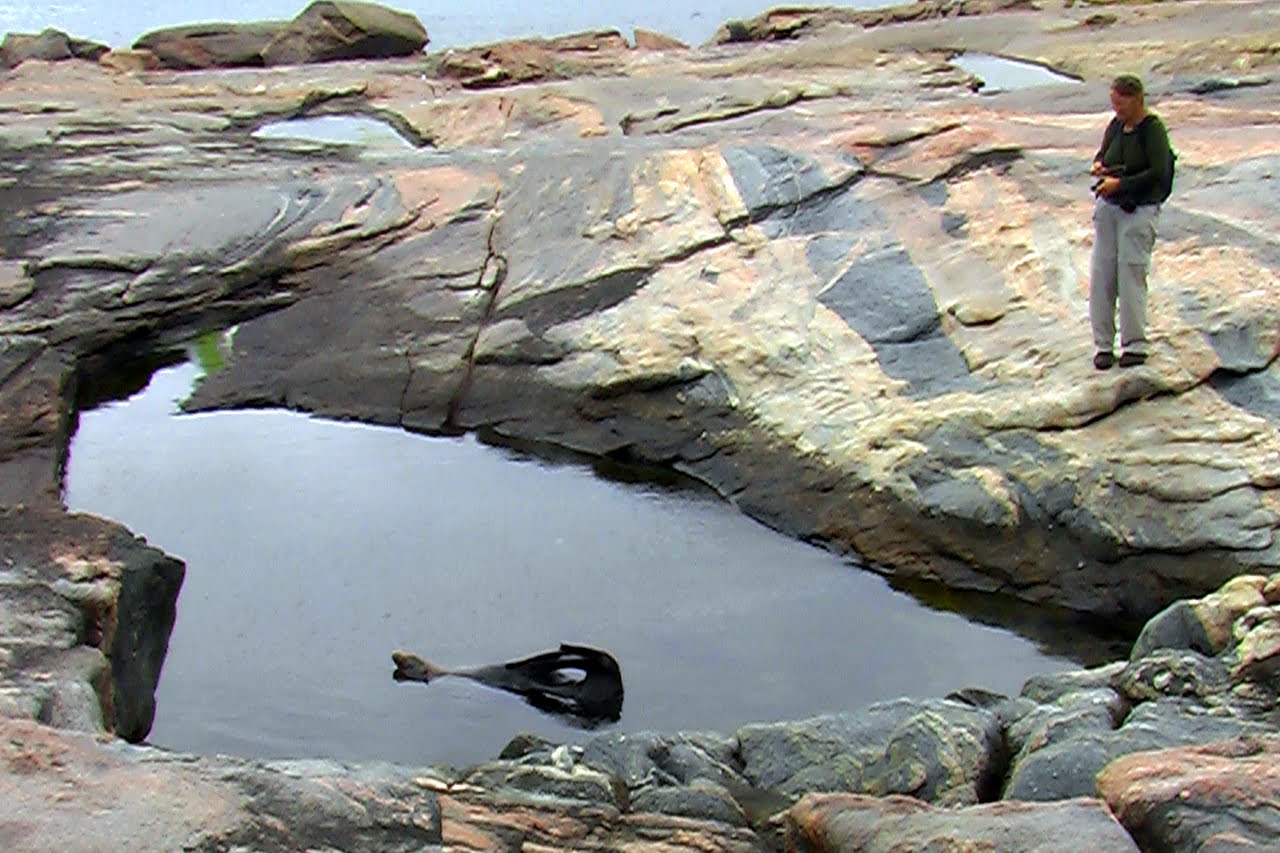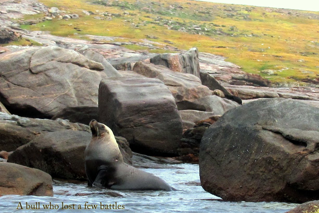 First orientation, we looked around, got our bearings, noting what’s close at hand. Two bulls not far away were giving each other stick and their land-lumbering bodies looked as if they could cause damage. Not a good idea to catch one by surprise. During our sortie, with some apprehension we carefully checked behind each rock as we passed. Three or four were curious, or territorial enough to have us back away and allow them their space. And while one mum was taking time off to bathe in an elevated pool, we surprised her pup, unintentionally, and he screamed a frightened yelp from a ledge away from her. Both looked very healthy animals and we hoped they’d stay that way. This is something which plays on our minds, the going ashore on these isolated islands rarely stepped upon.