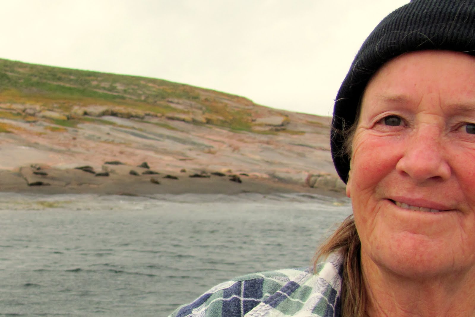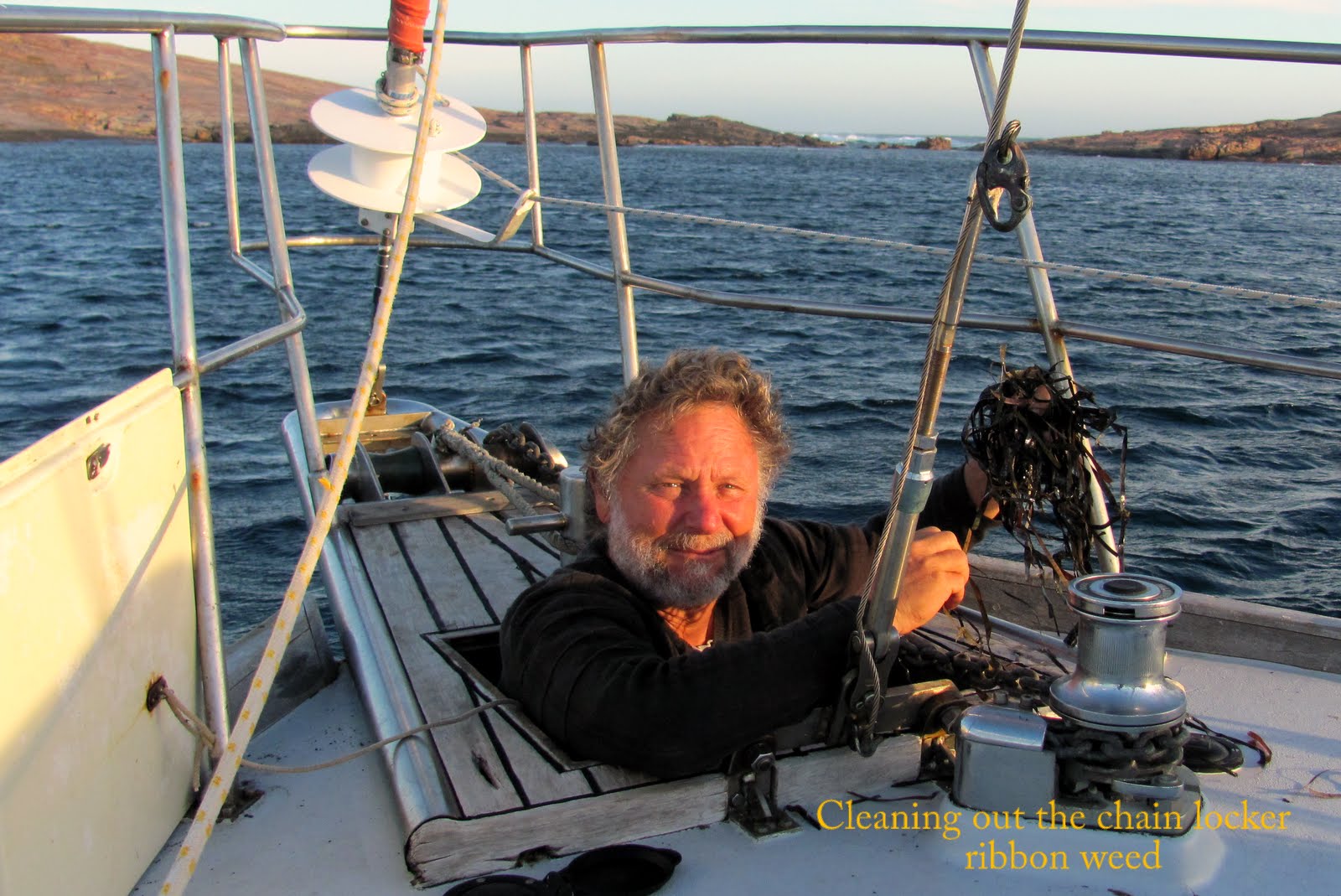 Cleaning out accumulated Ribbon Grass from anchor locker | Our first sight of Sea Lions. Jude's off to retrieve her camera |
