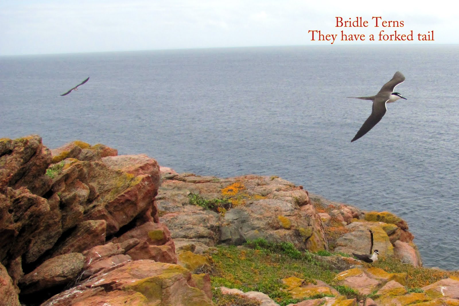 Apart from sitting atop the island’s summit to watch Bridled Terns soaring about we touched little and did nothing that could interfere with the islands’ integrity. By sitting still, the terns were soon landing beside us to shelter in the overhang. How great to see them at eye-level just a few feet in front, or on the wind floating like feathers. Down nearer sea-level a flock of Crested-Terns preferred to rest on the smooth granite, and in the far distance a pair of sea-eagles soared above the island on the upswept wind. While watching, one swooped and caught a tern. Then it flew off, each talon clutching a wing, its prey facing forward making it look just like a bi-plane.